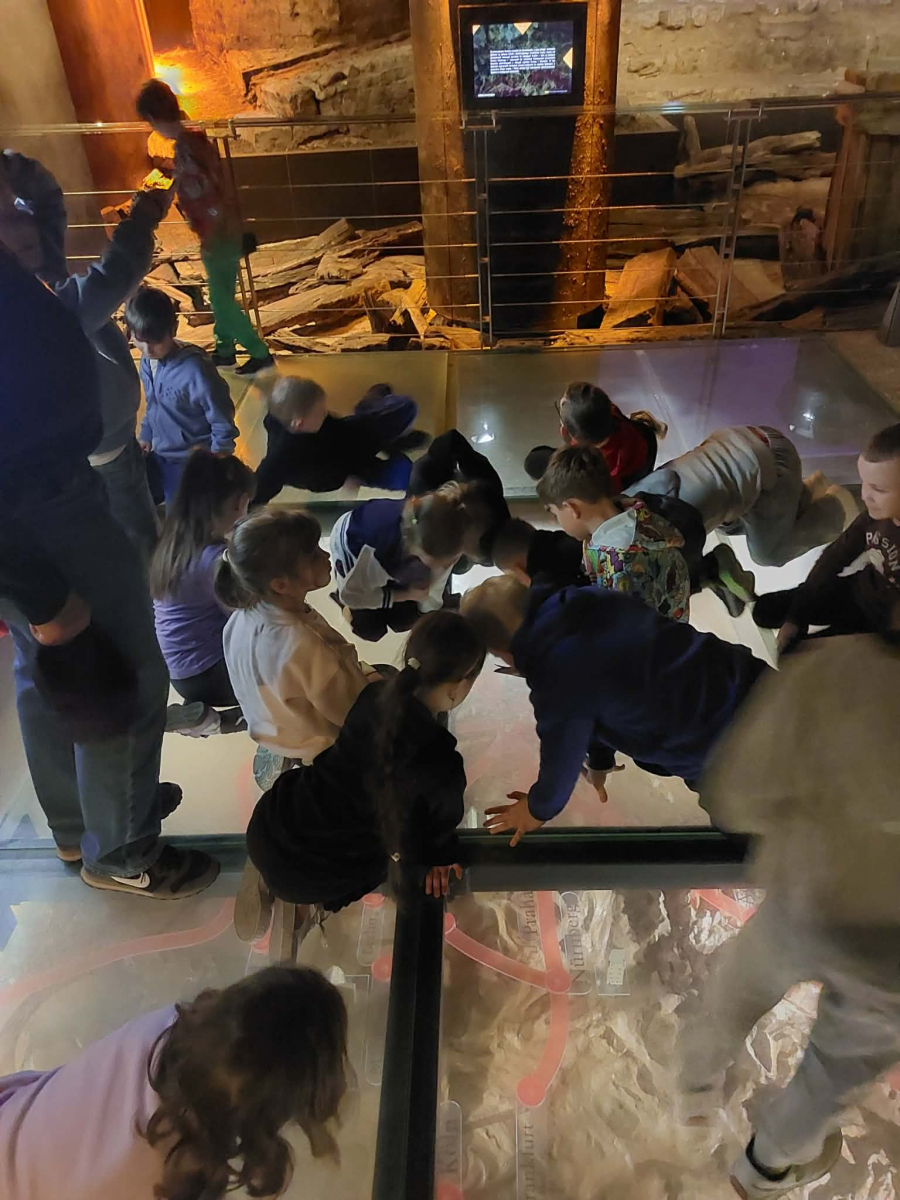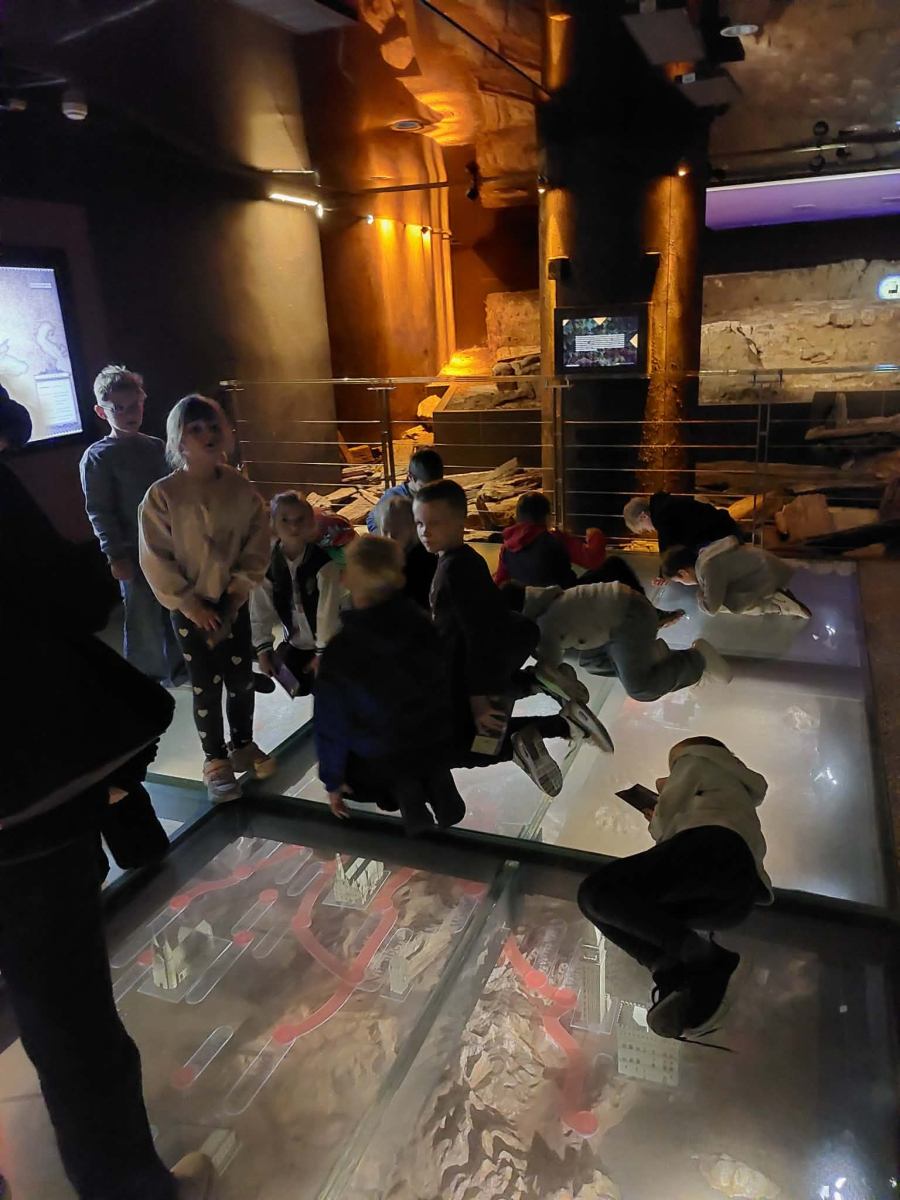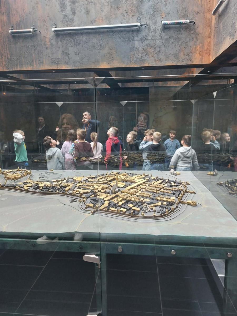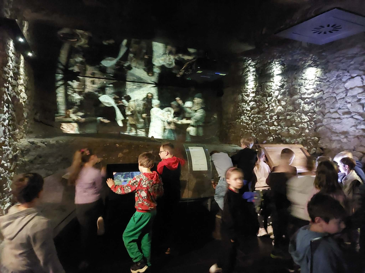 Kolejnym punktem programu był Rynk Główny. Punktualnie o pełnej godzinie zadarliśmy głowy wysoko, by wysłuchać hejnału płynącego z wieży Kościoła Mariackiego i pomachać do hejnalisty. Następnie zeszliśmy pod ziemię, by odkryć tajemnice dawnego miasta w multimedialnym Muzeum Podziemia Rynku. Nowoczesna ekspozycja zrobiła na uczniach ogromne wrażenie – mogliśmy zobaczyć, jak wyglądał Kraków setki lat temu!