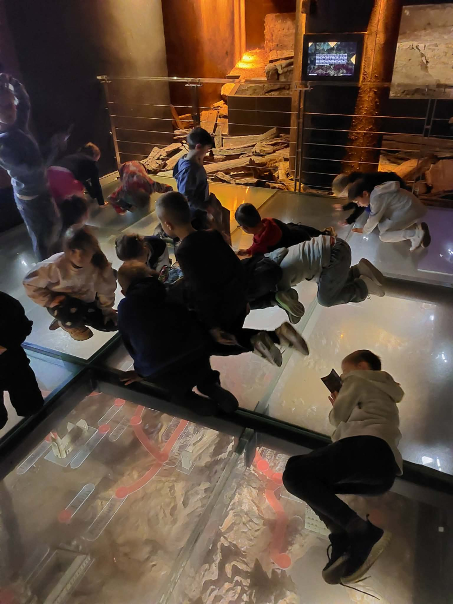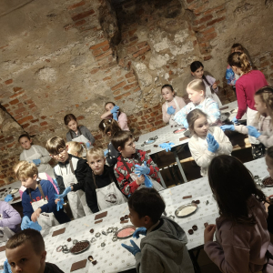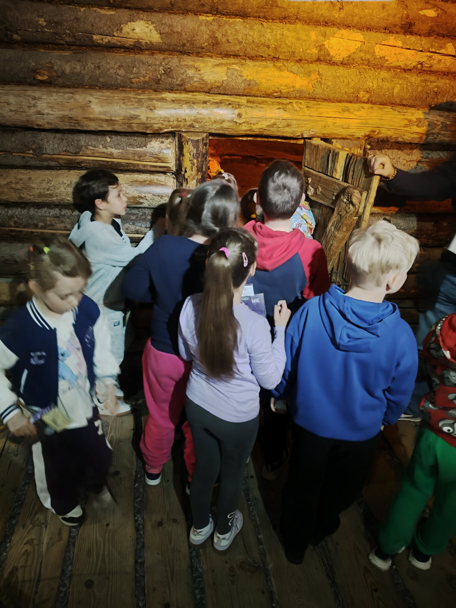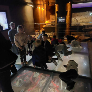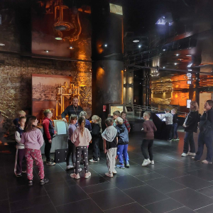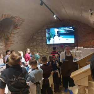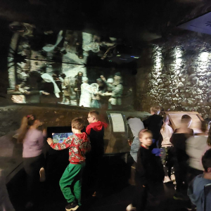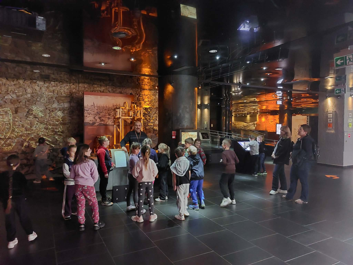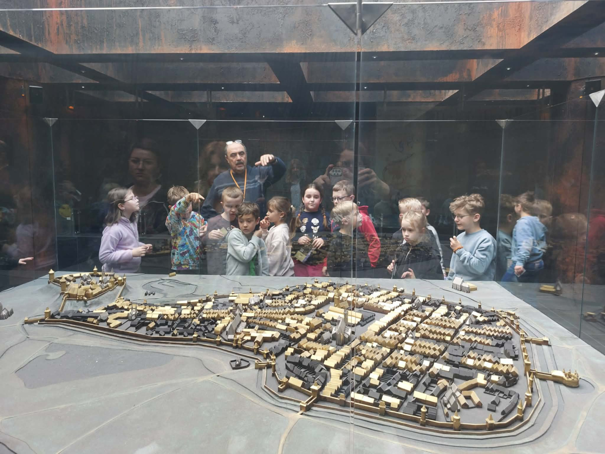 Kolejnym punktem programu był Rynk Główny. Punktualnie o pełnej godzinie zadarliśmy głowy wysoko, by wysłuchać hejnału płynącego z wieży Kościoła Mariackiego i pomachać do hejnalisty. Następnie zeszliśmy pod ziemię, by odkryć tajemnice dawnego miasta w multimedialnym Muzeum Podziemia Rynku. Nowoczesna ekspozycja zrobiła na uczniach ogromne wrażenie – mogliśmy zobaczyć, jak wyglądał Kraków setki lat temu!