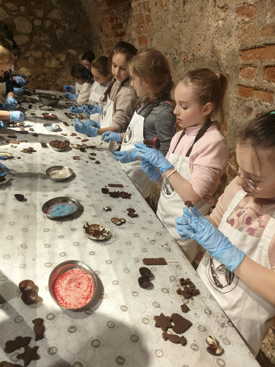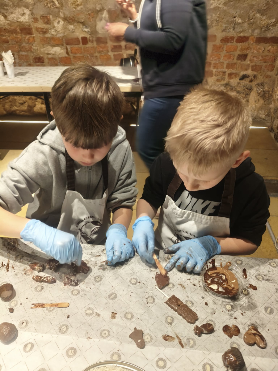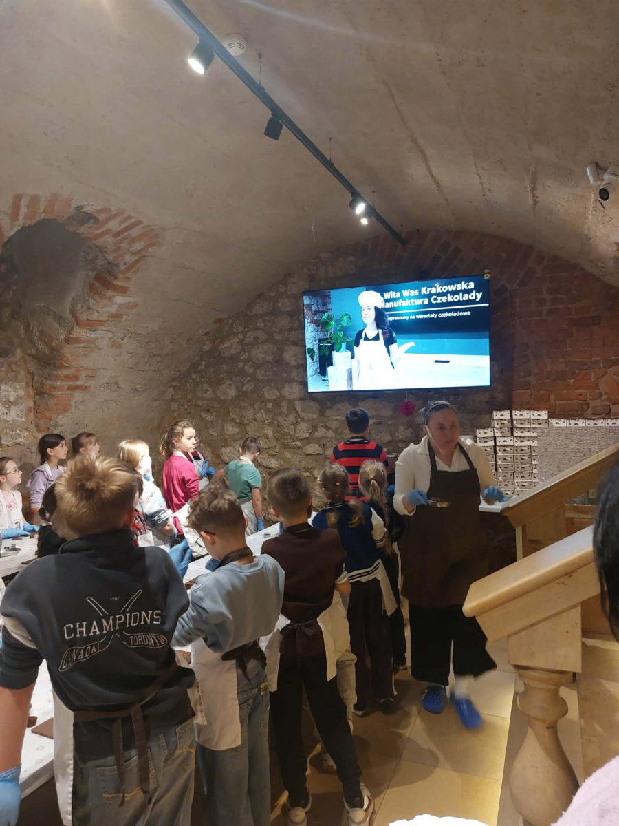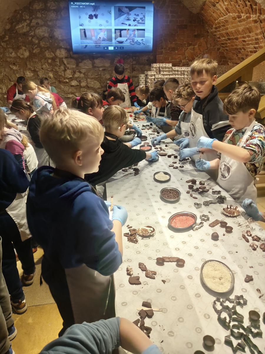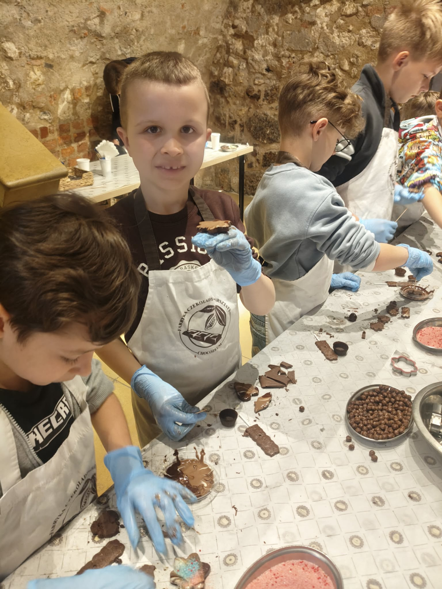 Naszą przygodę rozpoczęliśmy bardzo słodko - odwiedziliśmy Manufakturę Krakowskiej Czekolady. Każdy uczeń zamienił się w małego cukiernika i podczas warsztatów własnoręcznie przygotował swoje autorskie praliny. Zapach czekolady i radość z tworzenia własnych słodkości z pewnością na długo zostaną w naszej pamięci